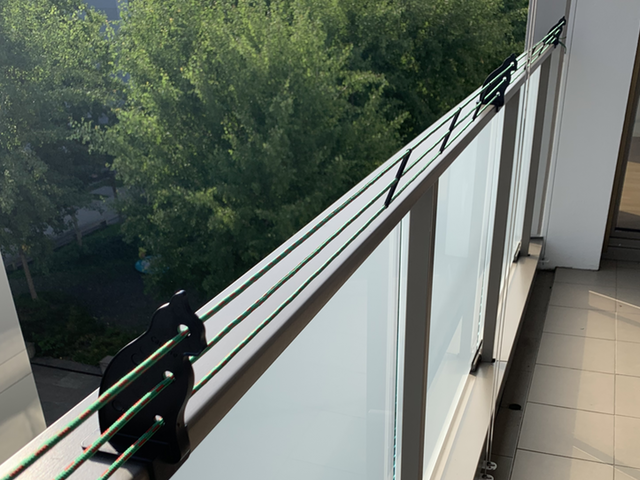Pour sécuriser votre balcon sans recourir à un filet, nous vous recommandons d'installer les ensembles Catsafe sur votre rambarde linéaire à barres arrondies, accompagnés d'un kit d'adaptation offrant une longueur variable, allant de 1,5 m à 15 m.